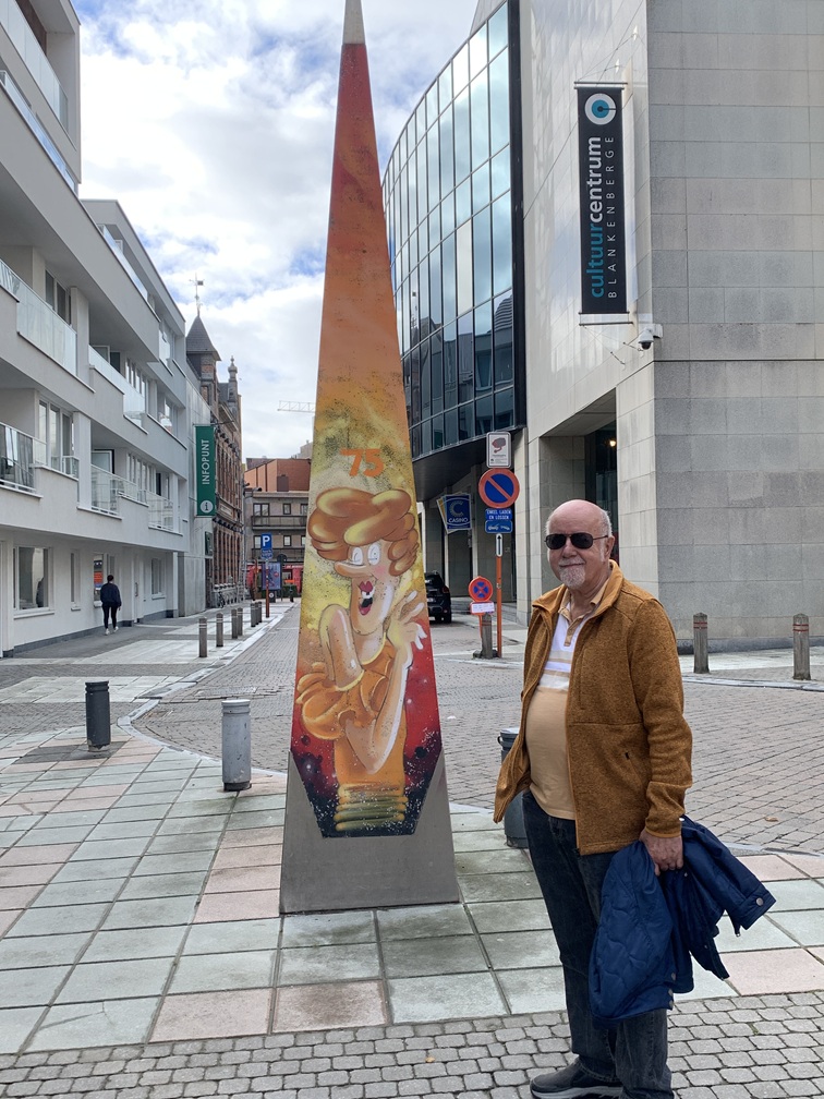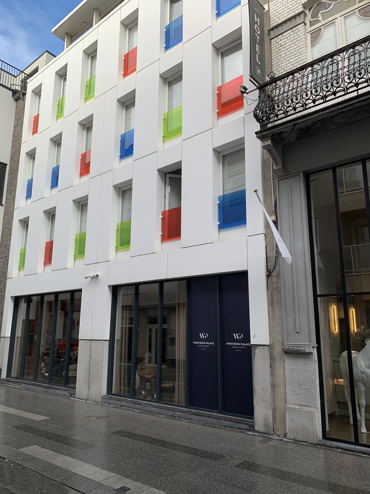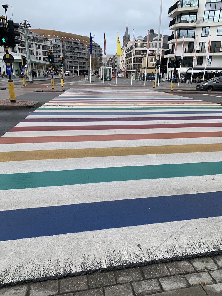 Maandag 13 oktober. Omdat wij eerder dit jaar zo tevreden waren over het Enjoy-hotel in Duitsland, hebben we dat nog een keer geprobeerd, nu in België, maar we zijn er inmiddels wél achter gekomen, dat niet al hun hotels even goed zijn. De reis begon vanochtend om 09:30 uur met de bus naar Utrecht CS. Van Utrecht uit met de Intercity naar Rotterdam CS, vervolgens de EurocityDirekt naar Brussel Zuid/Midi en tenslotte de (Belgische) Intercity naar Blankenberge. Totale reistijd, inclusief overstappen: 5 uur en een kwartier. Op de plaats van bestemming aangekomen was het eerste wat in het oog sprong een breed regenboog-zebrapad, verder de tramrails, de naam Blankenberge in grote letters en daarachter een leeg plein. Nadat we dat allemaal voorbij waren, moesten we nog ongeveer 10 minuten lopen tot aan het hotel.