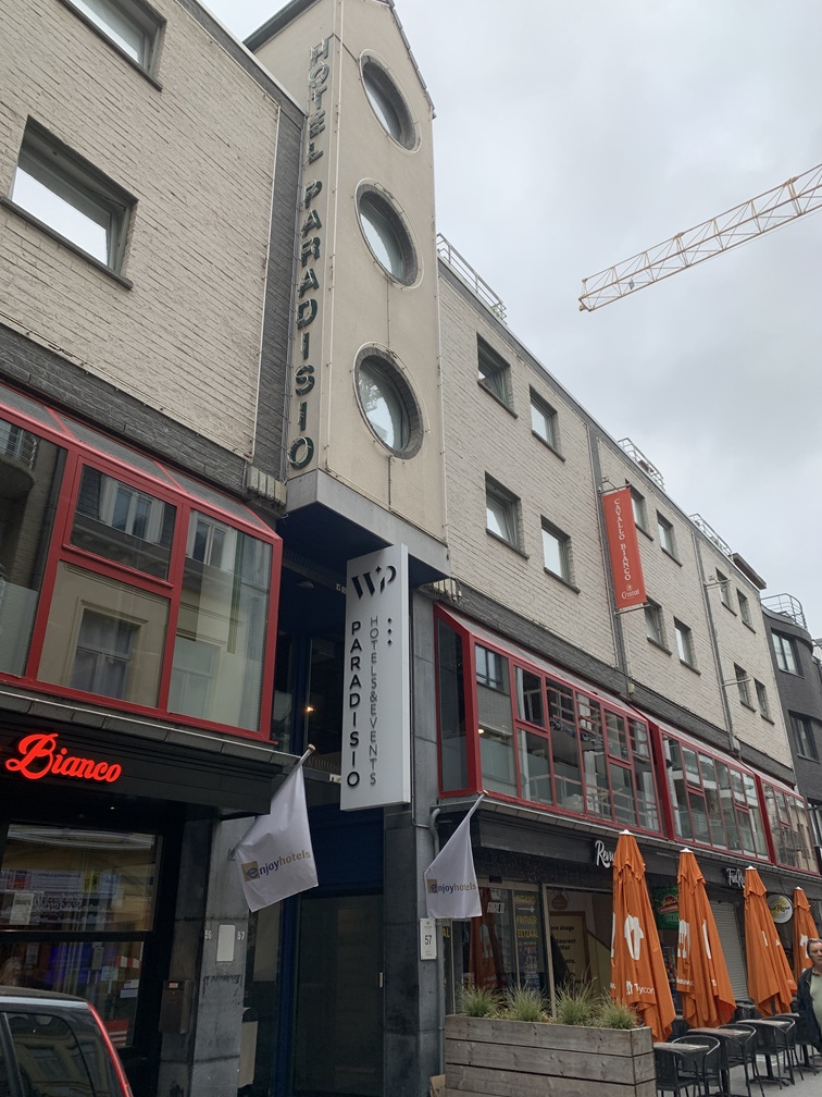 De naam van het hotel is onduidelijk gebleven. Wij hadden gereserveerd bij Hotel Noordzee, maar de neonverlichting aan de buitenkant toonde de naam Hotel Paradiso, terwijl op de deur dan wel weer Hotel Noordzee stond. Bij het inchecken werd ons verteld dat we voor het ontbijt, de lunch en het avondprogramma buitenom moesten en dan door een smalle gang naar een andere locatie. Dat bleek Hotel Blankenberge te zijn, ook wel bekend als Hotel Pantheon. Om het allemaal nog wat ingewikkelder te maken stond in beide hotels, op attributen en verwijsborden de naam Het Witte Paard (WP) en/of (in het italiaans) Cavallo Bianco. Vermoedelijk de bedrijfsnaam van de eigenaar van beide hotels.