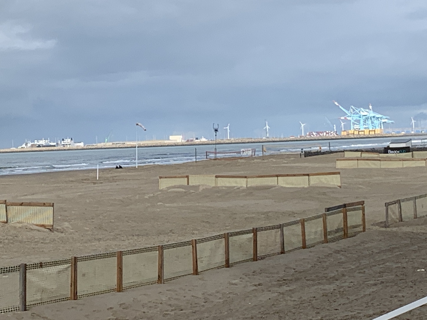 Nadat we ons hadden geïnstalleerd zijn we eerst even bij de zee wezen kijken via een trap naar de veel hoger gelegen strandboulevard die daar omzoomd wordt door kolossen van gebouwen (10-12 hoog) aan de achterkant en eet- en drinktentjes aan de zeekant. Vermoedelijk staan er in de zomer ook nog strandtenten op het heel brede strand, maar die waren er nu in ieder geval niet. Het zomerseizoen ligt immers al weer een tijdje achter ons. De zilte zeelucht ontbrak omdat daarvoor de (zwakke) wind uit de verkeerde hoek waaide. Terug van de wandeling zijn we rond 17:00 uur naar de eetzaal gegaan voor een wijntje (dat te koud werd geserveerd) en hebben we een tafel aan het raam voor onszelf vastgelegd met een "gereserveerd"-kaartje waar onze naam op stond. Daar zitten we dan de rest van de dagen tijdens het avondeten. Er was geen buffet of keuzemenu, maar wat we voorgeschoteld kregen bleek verrassend goed te zijn: groentesoep, varkenshaas, aardappelkroketjes en wél een uitgebreide eigen keuze aan salades. Na het toetje (aardbeienvlaai) hebben we nog koffie en thee gedronken, en zijn daarna naar de andere locatie gegaan, waar we wat hebben zitten lezen en puzzelen. Niet heel lang trouwens, want zo'n reisdag is best vermoeiend en we lagen dan ook al op tijd op bed.