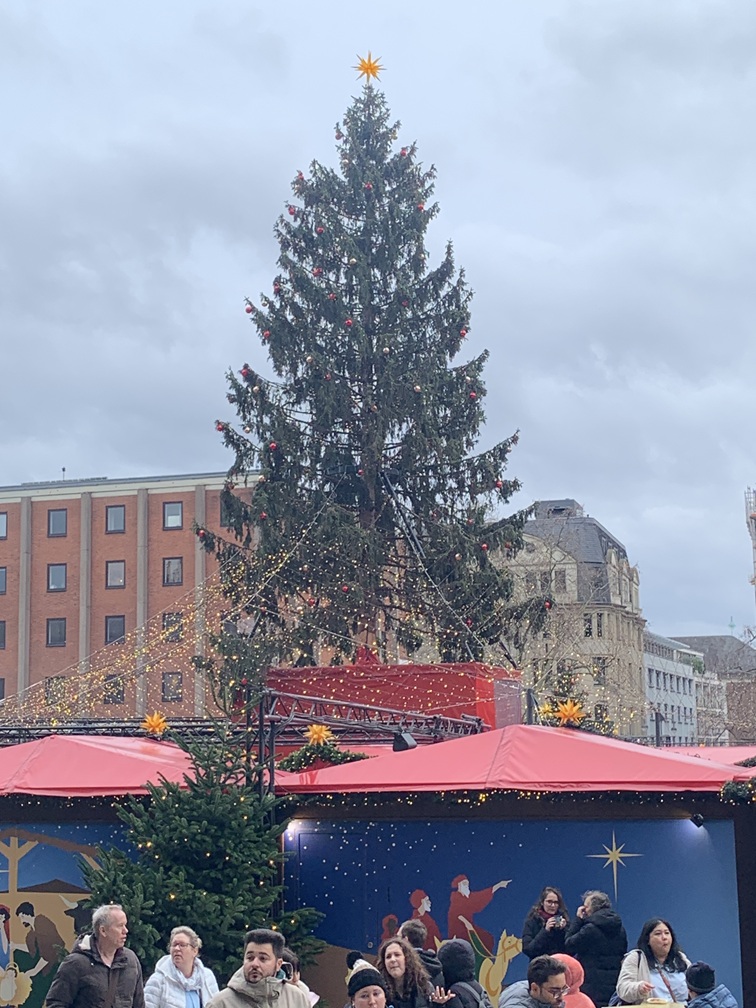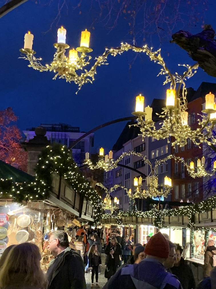 Donderdag 11 december. Het was bijzonder zonnig vandaag, maar wél wat kouder dan de afgelopen dagen. Regen hebben we niet gehad, behoudens een paar druppels die voornamelijk 's nachts zijn gevallen. Tot vandaag hadden we 4 verschillende kerstmarkten bezocht, Hafen, Am Dom, Altermarkt en Heumarkt. Daar hebben we nu de Neumarkt aan toegevoegd.Omdat die iets verder van ons hotel af ligt hebben we daarvoor gebruik gemaakt van de Bimmelbahn. Dat is het toeristentreintje, dat elke dag door Keulen rijdt en waarvoor je een hop-on-hop-off ticket koopt dat geldig is voor één rondje, dus totdat je weer bij je beginpunt bent aanbeland. Zo hebben we meteen nog iets van de stad gezien. In het treintje wordt er via een geluidsinstallatie informatie over de stad gedeeld met de reizigers, maar vooral tijdens het eerste stuk hebben we het meeste daarvan gemist. We zaten namelijk nét voor een paar Engelse dames, die persé daar bovenuit wilden komen en nog geen 10 seconden hun mond hebben gehouden.