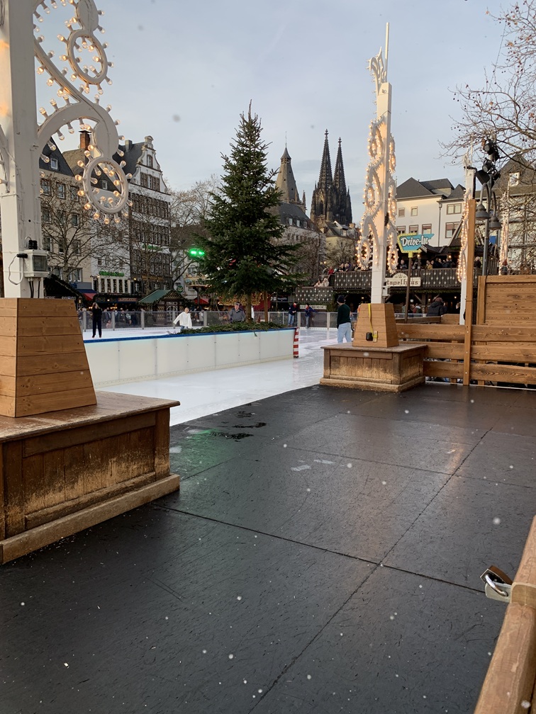 Na dat simpele ontbijtje zijn we naar het Imhoff Schokoladenmuseum gewandeld. Daar hebben we iets gezien over de geschiedenis en de productie van het "bruine goud" waar we ook iets van mochten proeven en uiteraard ook kopen, maar dat laatste hebben we niet gedaan. Na het museum hebben we de hafen-kerstmarkt bezocht. Dat is de kleinste van alle Keulse kerstmarkten, maar ze hebben er wel het reuzenrad. We hebben daar een eierpunch geprobeerd, maar daar zat veel te veel citroen in en was niet lekker. Het broodje bratwurst daarentegen ging er wel in. Even terug naar het hotel om Lia's voet wat rust te gunnen.