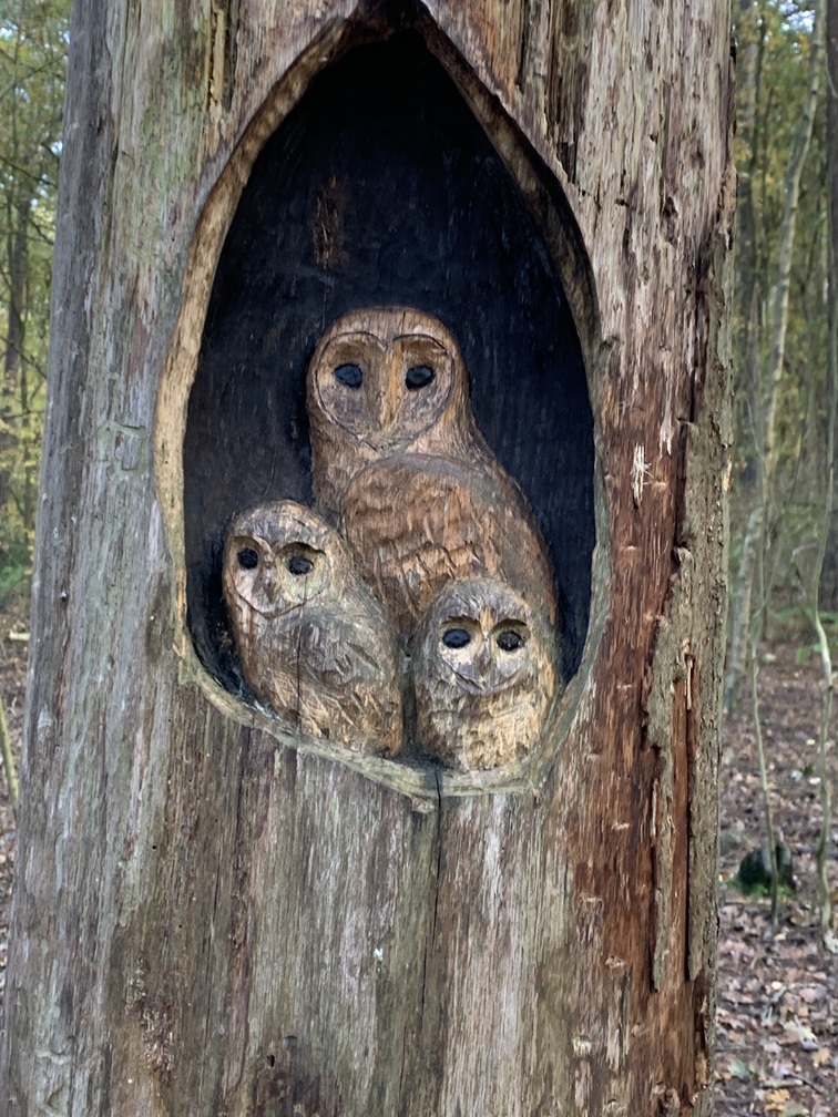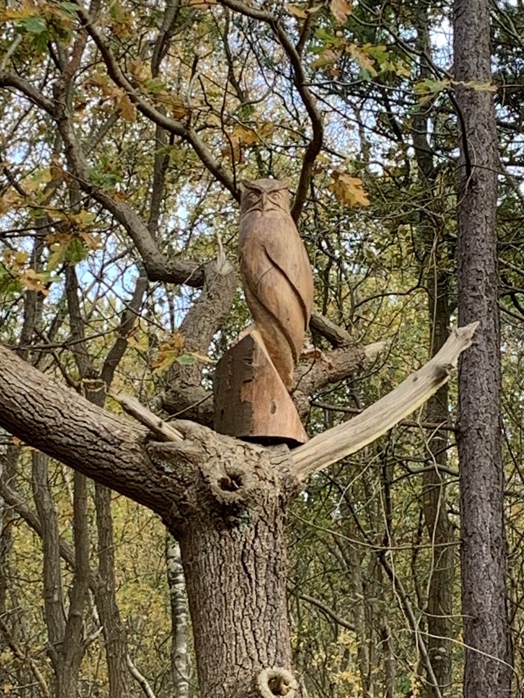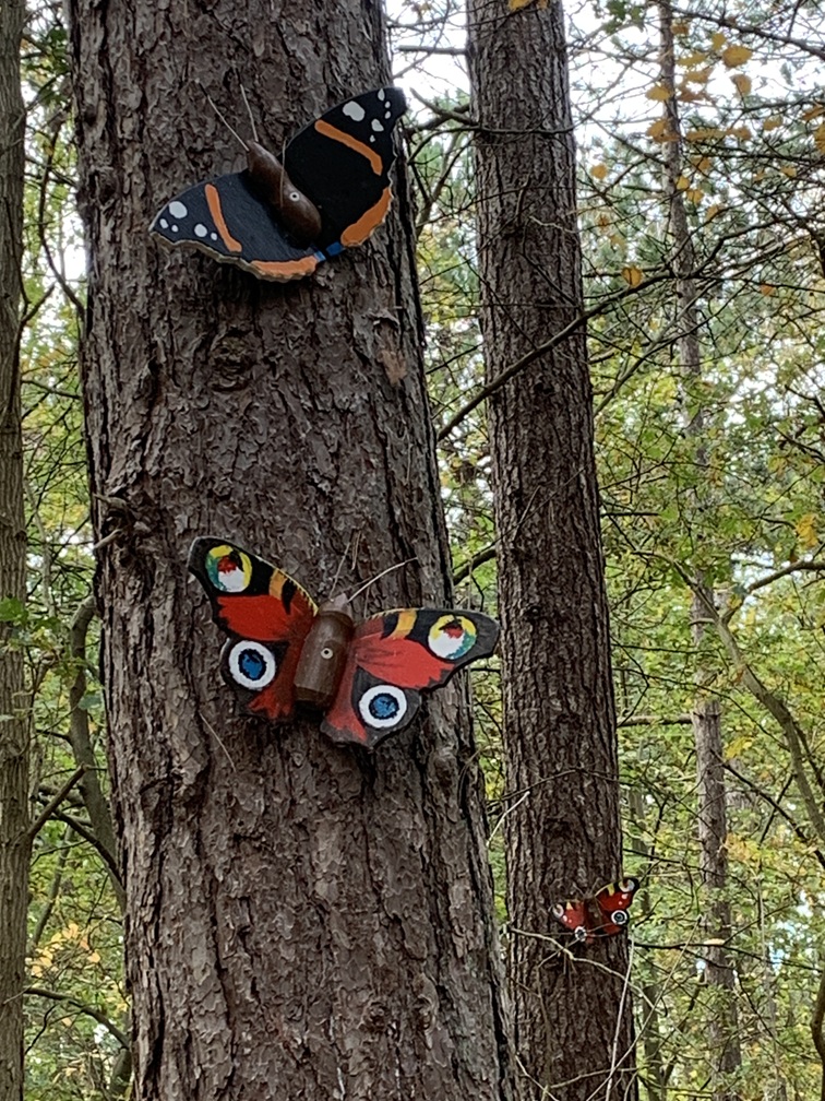 Dinsdag 4 november. Het zag er vanmorgen een stuk vriendelijker uit. De zon scheen tussen de wolken door en het is droog gebleven. Wél was er nog steeds veel wind. We hebben de fietsen uit de auto gehaald en zijn rond 12:30 uur naar Vis van Beek gefietst voor een heerlijk vistrio (hollandse garnalen, gerookte zalm en paling). Daarna zijn we verder gefietst naar het Sommeltjespad, een wandelpad door de Texelse bossen, waarbij je allerlei grappige kunstwerkjes tegenkomt. Paaltjes met voetjes geven de looproute aan en paaltjes met oogjes attenderen je op een "bezienswaardigheidje". Het is eigenlijk vooral voor kinderen, maar de beweging is voor iedereen goed en het was toch leuk om het een keer gezien te hebben.