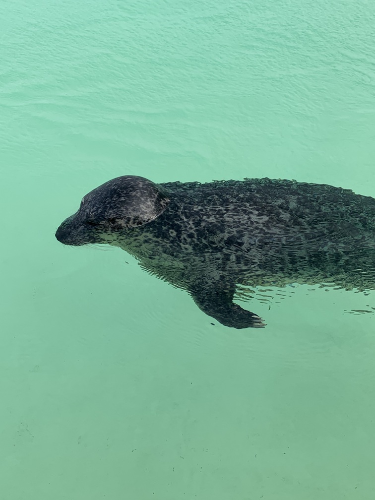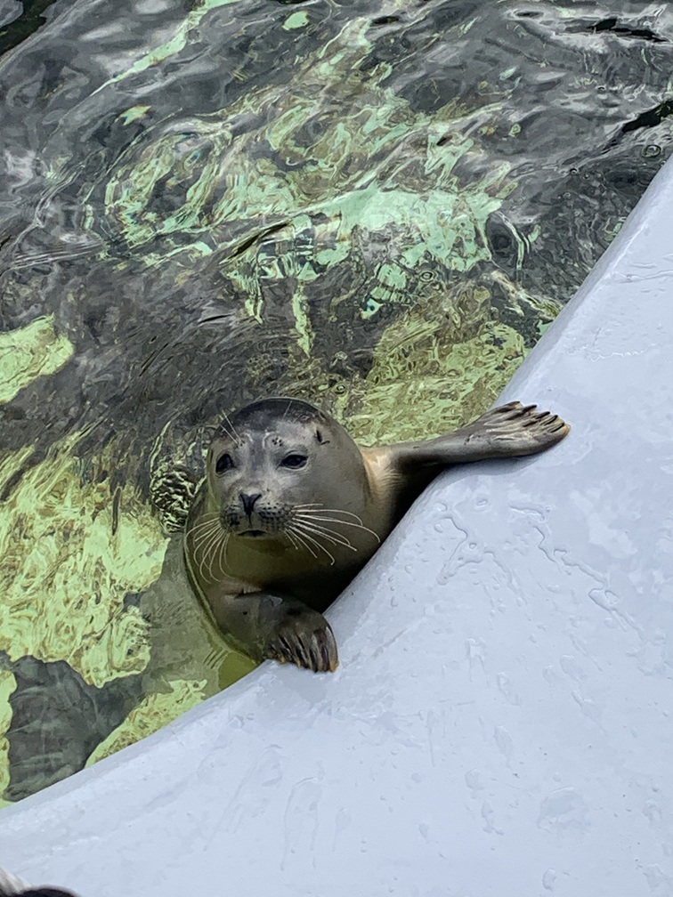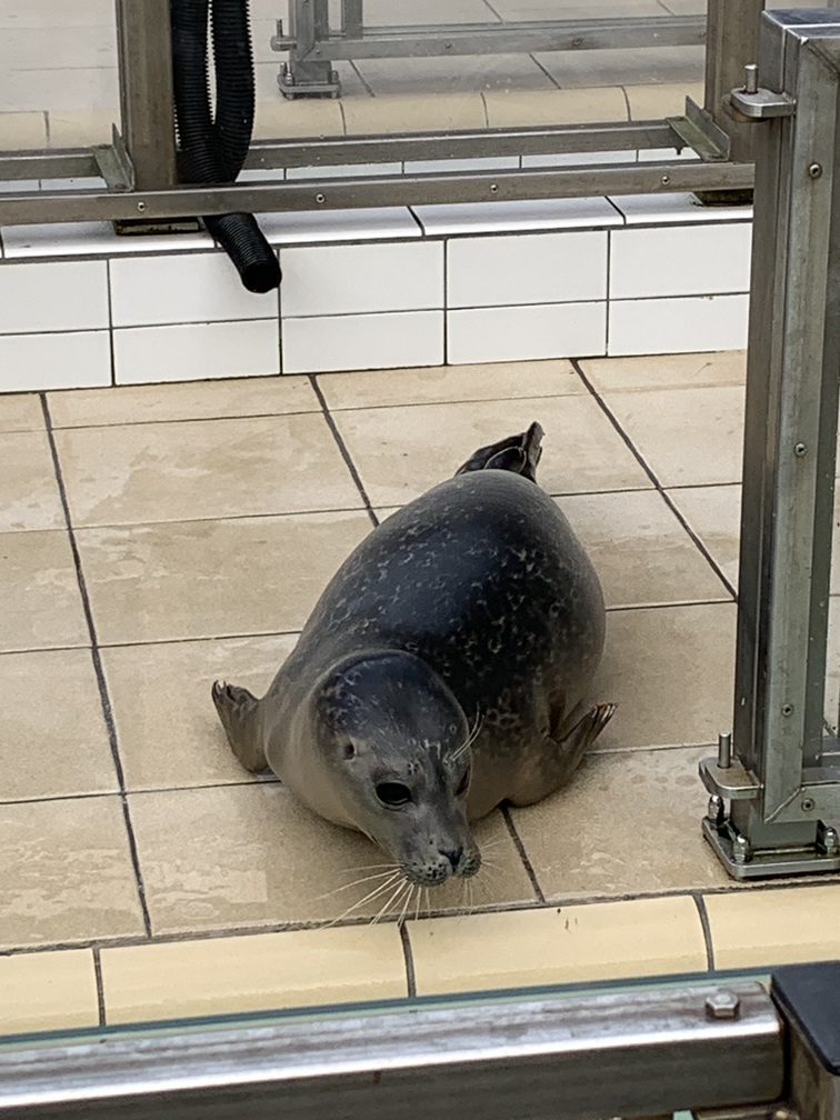 Na de wandeling hebben we de fietsen weer gepakt en zijn naar Ecomare gereden. Daar waren we al eens eerder geweest, maar in onze herinnering meer dan 10 jaar geleden. Er worden nog steeds zeehonden opgevangen en verzorgd en sommige blijven daar voorgoed omdat ze niet meer "in het wild" kunnen overleven. Met ons bezoek helpen we dan toch weer een beetje met de financiering daarvan. Er zitten daar overigens niet alleen zeehonden, maar ook (al dan niet besmeurde) watervogels en allerlei exotische zeedieren (haaien, roggen, garnalen, enz.) in een aquarium. Natuurlijk hebben we ook even gekeken bij het voederen.