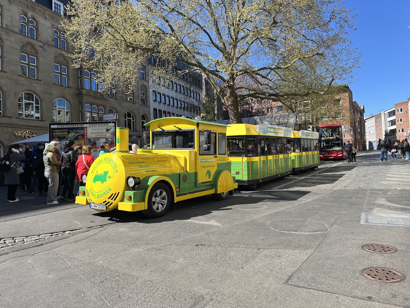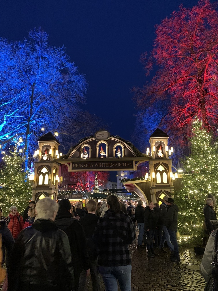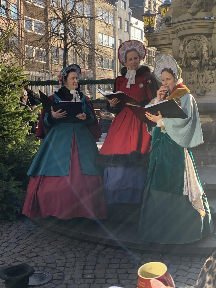 Donderdag 11 december. Het was bijzonder zonnig vandaag, maar wél wat kouder dan de afgelopen dagen. Regen hebben we niet gehad, behoudens een paar druppels die voornamelijk 's nachts zijn gevallen. Tot vandaag hadden we 4 verschillende kerstmarkten bezocht, Hafen, Am Dom, Altermarkt en Heumarkt. Daar hebben we nu de Neumarkt aan toegevoegd.Omdat die iets verder van ons hotel af ligt hebben we daarvoor gebruik gemaakt van de Bimmelbahn. Dat is het toeristentreintje, dat elke dag door Keulen rijdt en waarvoor je een hop-on-hop-off ticket koopt dat geldig is voor één rondje, dus totdat je weer bij je beginpunt bent aanbeland. Zo hebben we meteen nog iets van de stad gezien. In het treintje wordt er via een geluidsinstallatie informatie over de stad gedeeld met de reizigers, maar vooral tijdens het eerste stuk hebben we het meeste daarvan gemist. We zaten namelijk nét voor een paar Engelse dames, die persé daar bovenuit wilden komen en nog geen 10 seconden hun mond hebben gehouden.