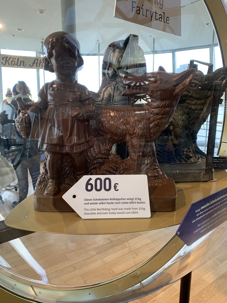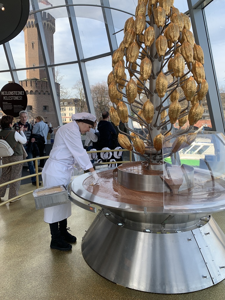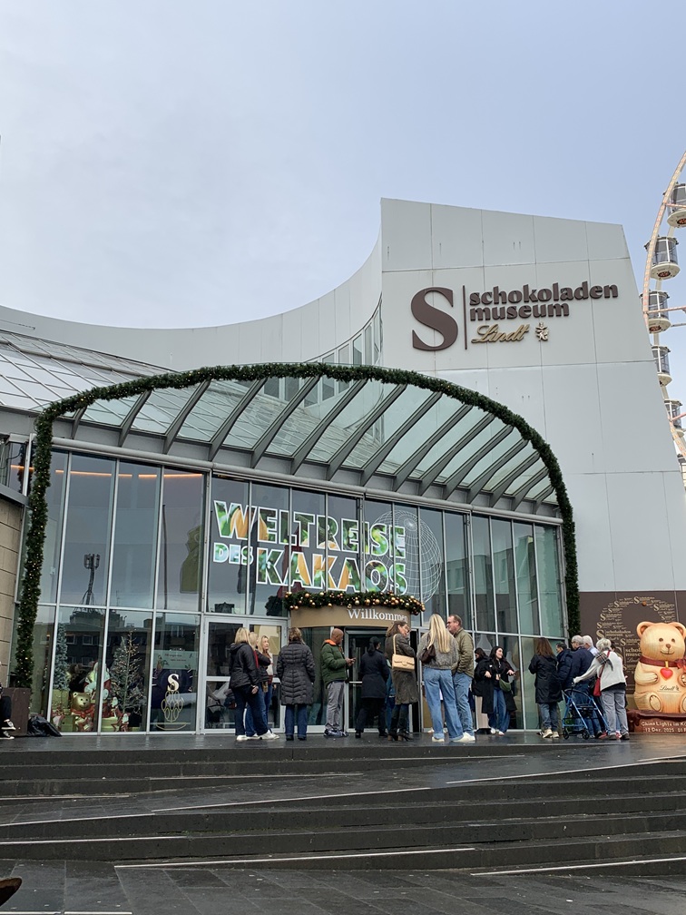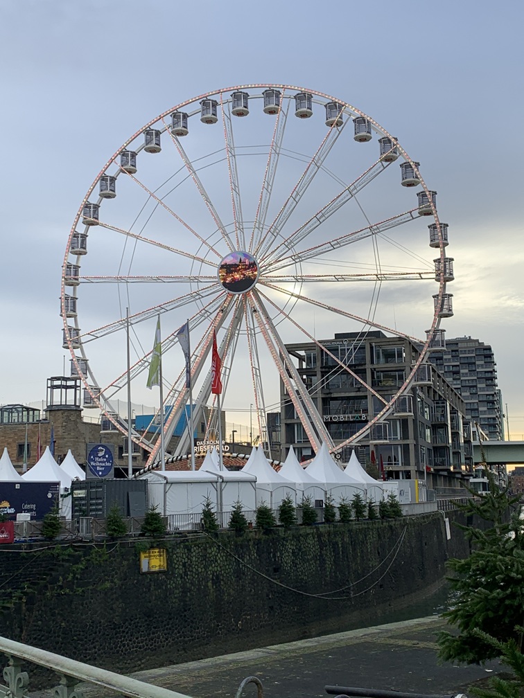 Na dat simpele ontbijtje zijn we naar het Imhoff Schokoladenmuseum gewandeld. Daar hebben we iets gezien over de geschiedenis en de productie van het "bruine goud" waar we ook iets van mochten proeven en uiteraard ook kopen, maar dat laatste hebben we niet gedaan. Na het museum hebben we de hafen-kerstmarkt bezocht. Dat is de kleinste van alle Keulse kerstmarkten, maar ze hebben er wel het reuzenrad. We hebben daar een eierpunch geprobeerd, maar daar zat veel te veel citroen in en was niet lekker. Het broodje bratwurst daarentegen ging er wel in. Even terug naar het hotel om Lia's voet wat rust te gunnen.