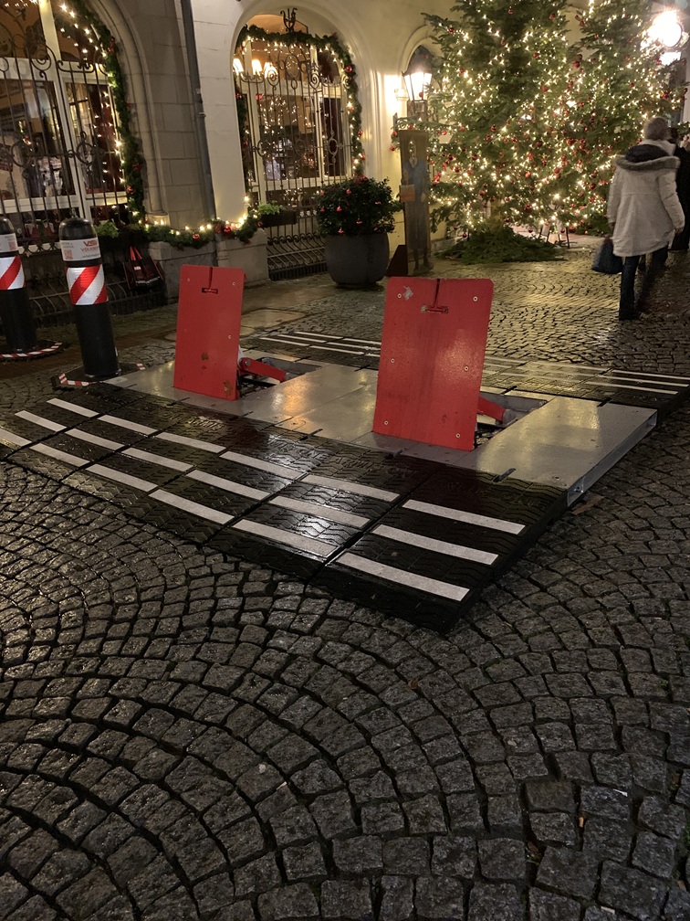 1. Je hoort veel over aanslagen en auto's die in volle vaart zo'n markt oprijden om maar zo veel mogelijk slachtoffers te maken. Dat kan je echter in je eigen omgeving ook overkomen, dus daar hoeven we niet voor thuis te blijven. De kerstmarkten hier in Keulen worden beveiligd met zware metalen constructies, waar je misschien met een tank wel doorheen rijdt, maar met een personenauto écht niet. Ze kunnen ook tijdelijk plat gelegd worden om b.v. een ambulance door te laten of het toeristentreintje dat hier door de stad rijdt. Bij elke blokkade staat een beveiliger, die dat in de gaten houdt en de installatie bedient, als het nodig is. Wij denken dat het wel veilig is.