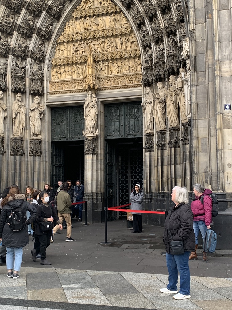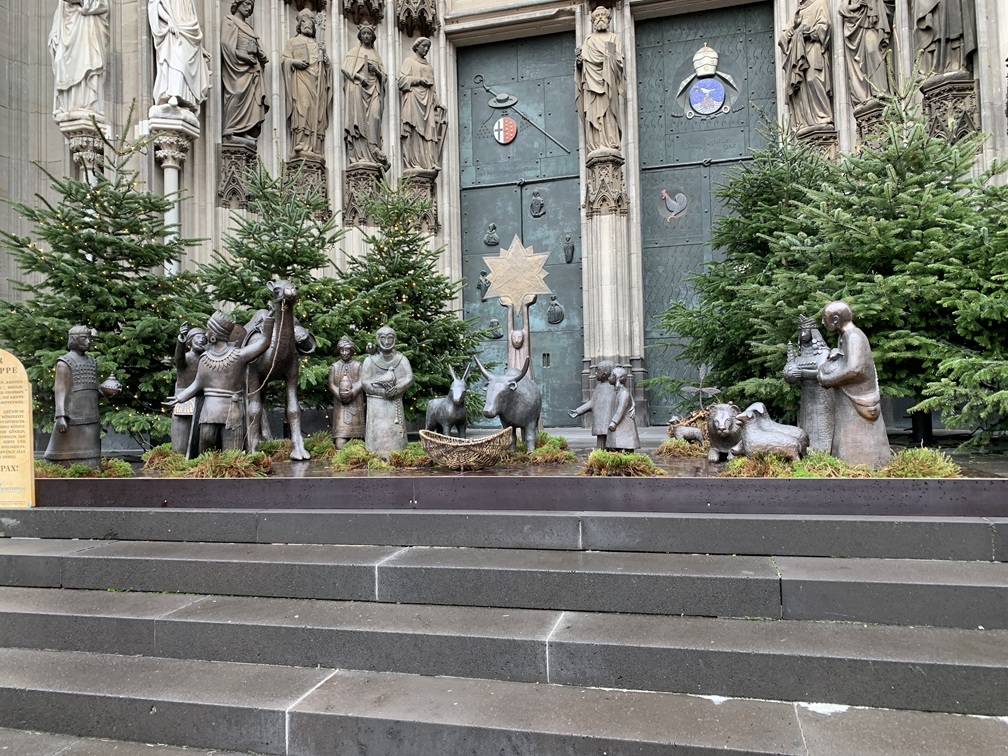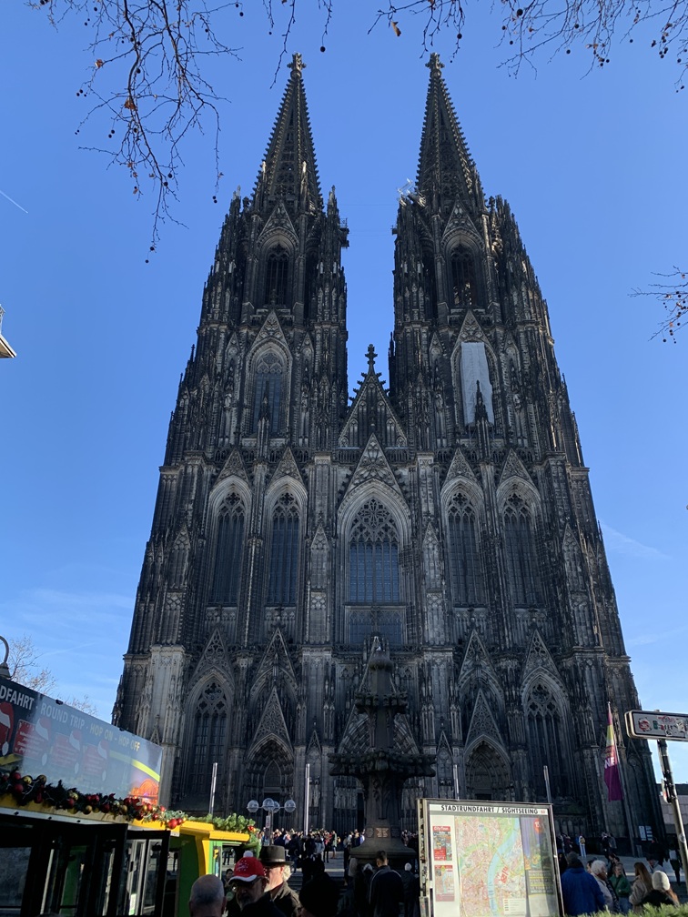 Woensdag 10 december. Onze eerste activiteit van vandaag was een bezoek aan de Dom van Keulen. De toegang tot de kerk is gratis, maar om de torens te beklimmen moet je wel betalen. Dat is aan ons echter toch niet besteed (veel te hoog en veel te veel traptreden). Het kerkgebouw zelf is overigens ook immens hoog, als je je voorstelt hoe hoog de gemiddelde kerk in Nederland is, dan staat er hier nog gewoon een kerk bovenop.