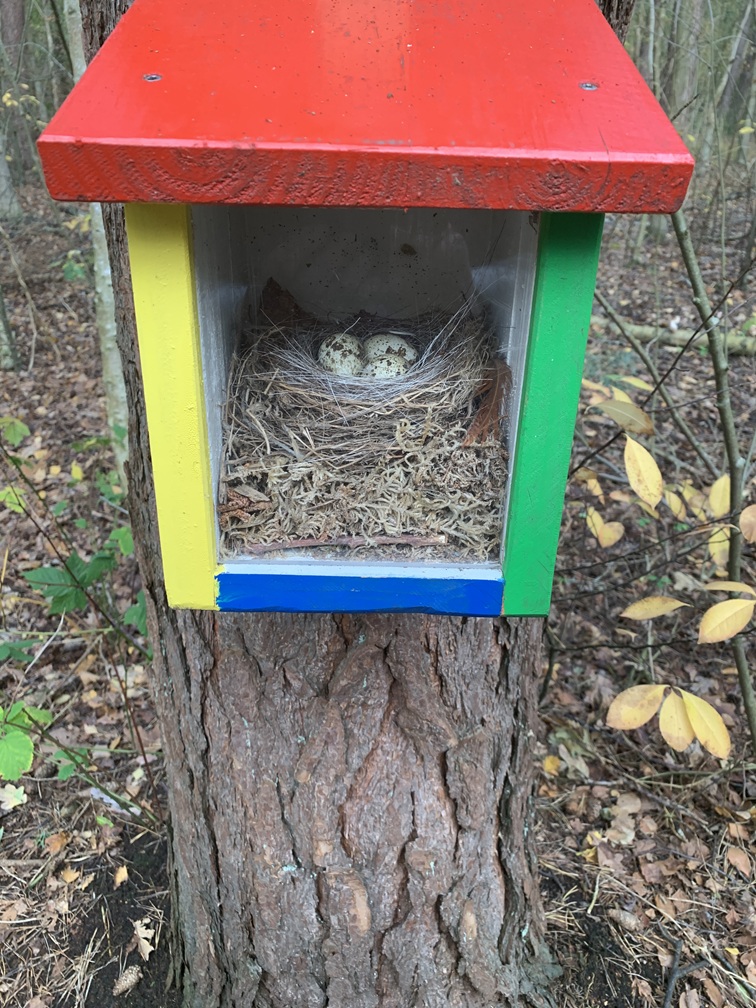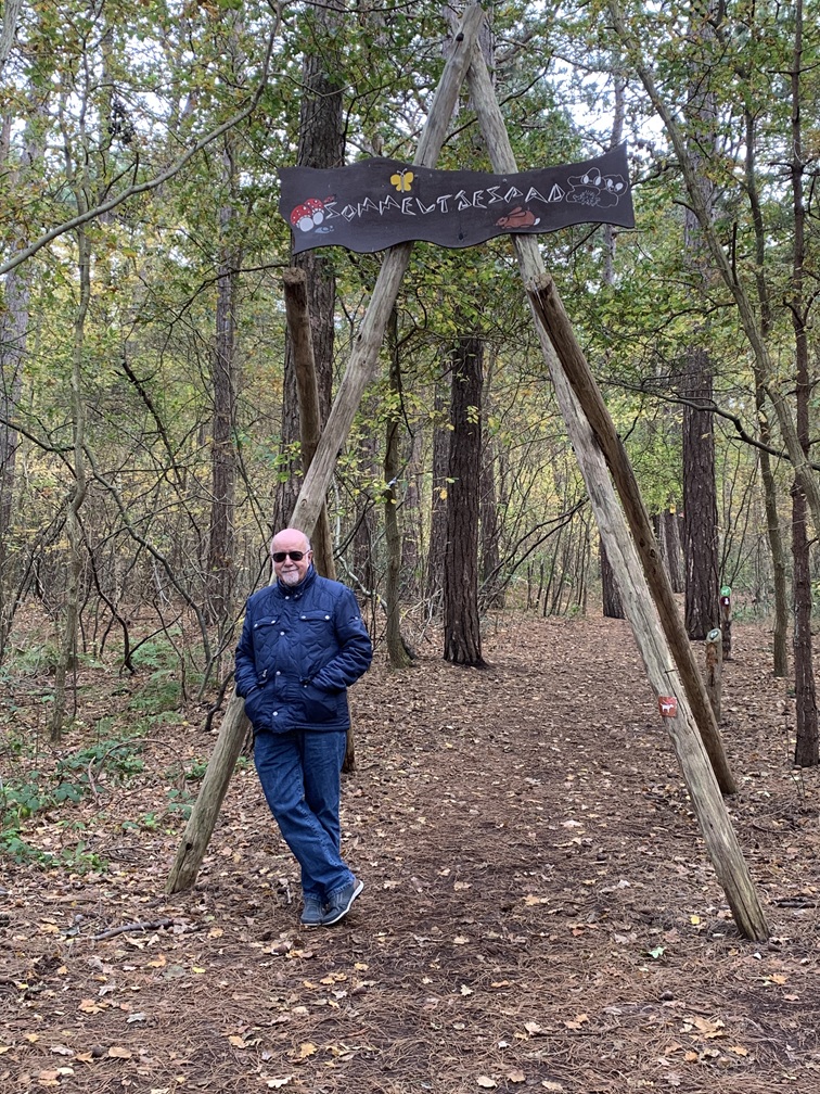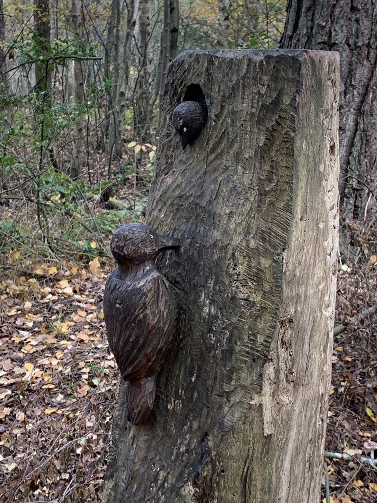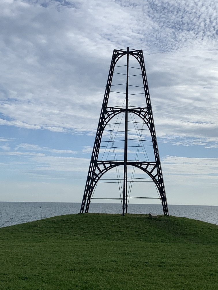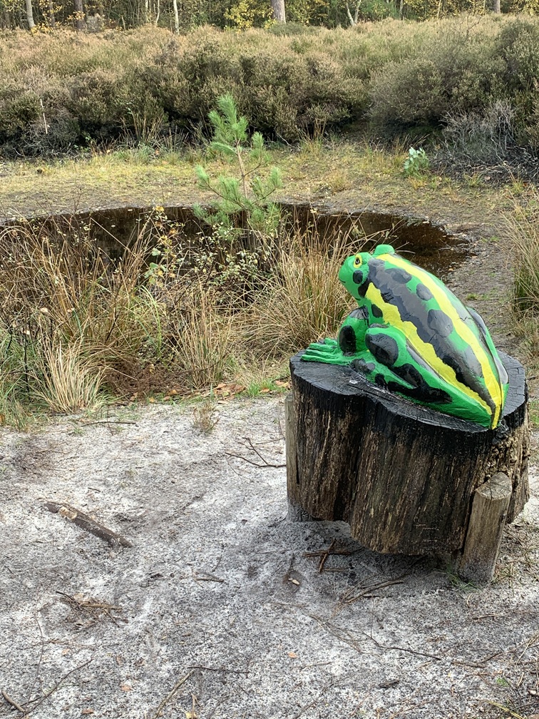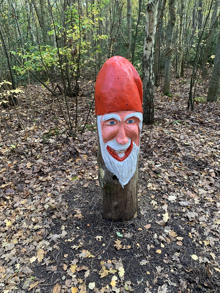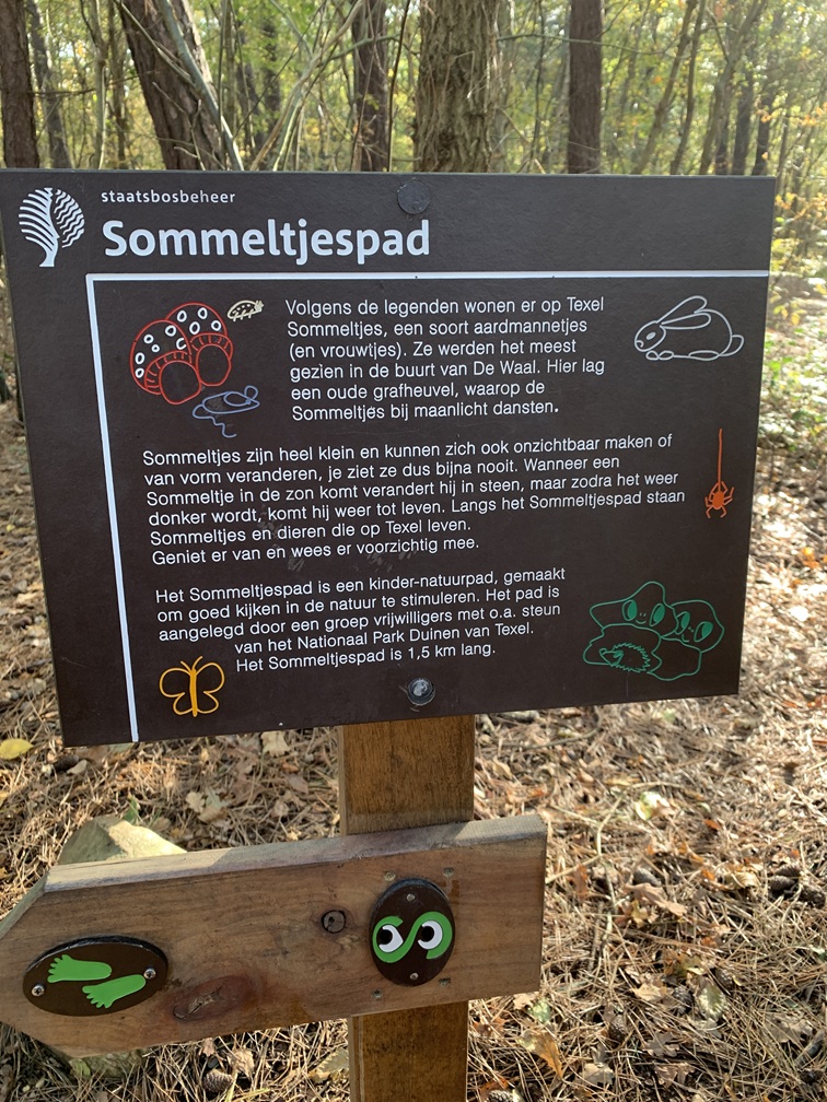 Dinsdag 4 november. Het zag er vanmorgen een stuk vriendelijker uit. De zon scheen tussen de wolken door en het is droog gebleven. Wél was er nog steeds veel wind. We hebben de fietsen uit de auto gehaald en zijn rond 12:30 uur naar Vis van Beek gefietst voor een heerlijk vistrio (hollandse garnalen, gerookte zalm en paling). Daarna zijn we verder gefietst naar het Sommeltjespad, een wandelpad door de Texelse bossen, waarbij je allerlei grappige kunstwerkjes tegenkomt. Paaltjes met voetjes geven de looproute aan en paaltjes met oogjes attenderen je op een "bezienswaardigheidje". Het is eigenlijk vooral voor kinderen, maar de beweging is voor iedereen goed en het was toch leuk om het een keer gezien te hebben.