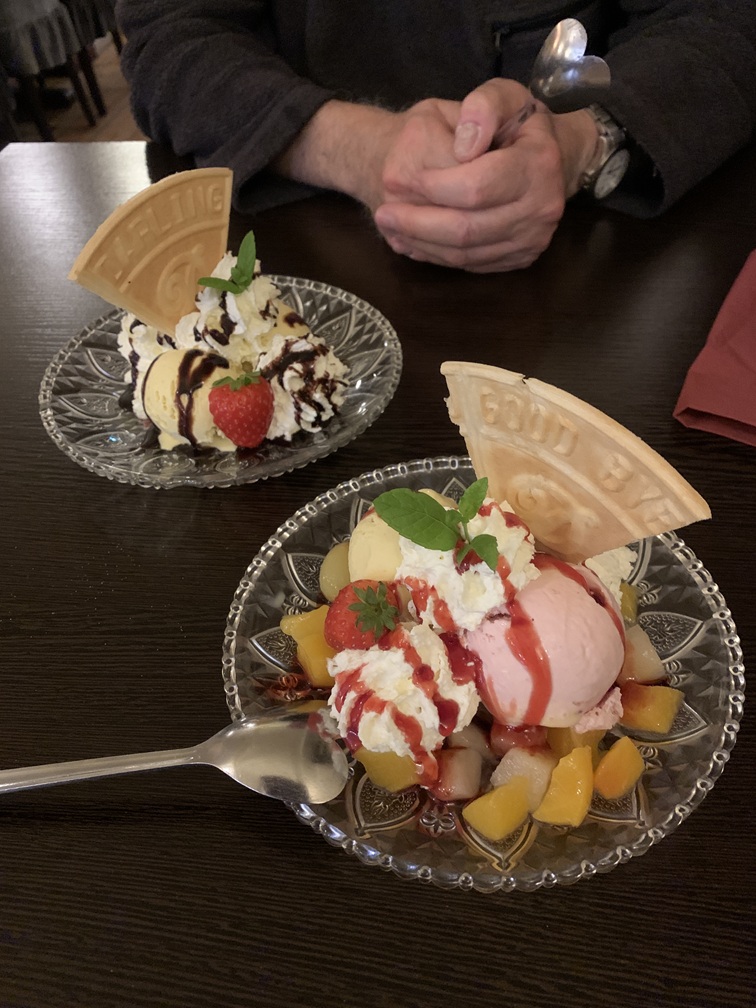 De fietsen hebben we alvast in de auto gezet en voor het avondeten zijn we nog een keer naar Cascade gegaan. Vooral de vissoep is er heerlijk, maar bij het hoofdgerecht bleek de zalm helaas iets te lang gebakken. De toetjes daarentegen waren weer lekker. Terug in het hotel zijn we alvast begonnen met inpakken.
